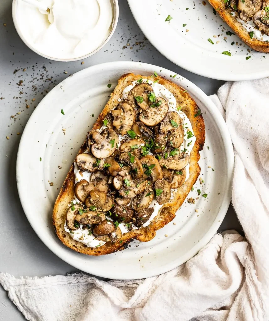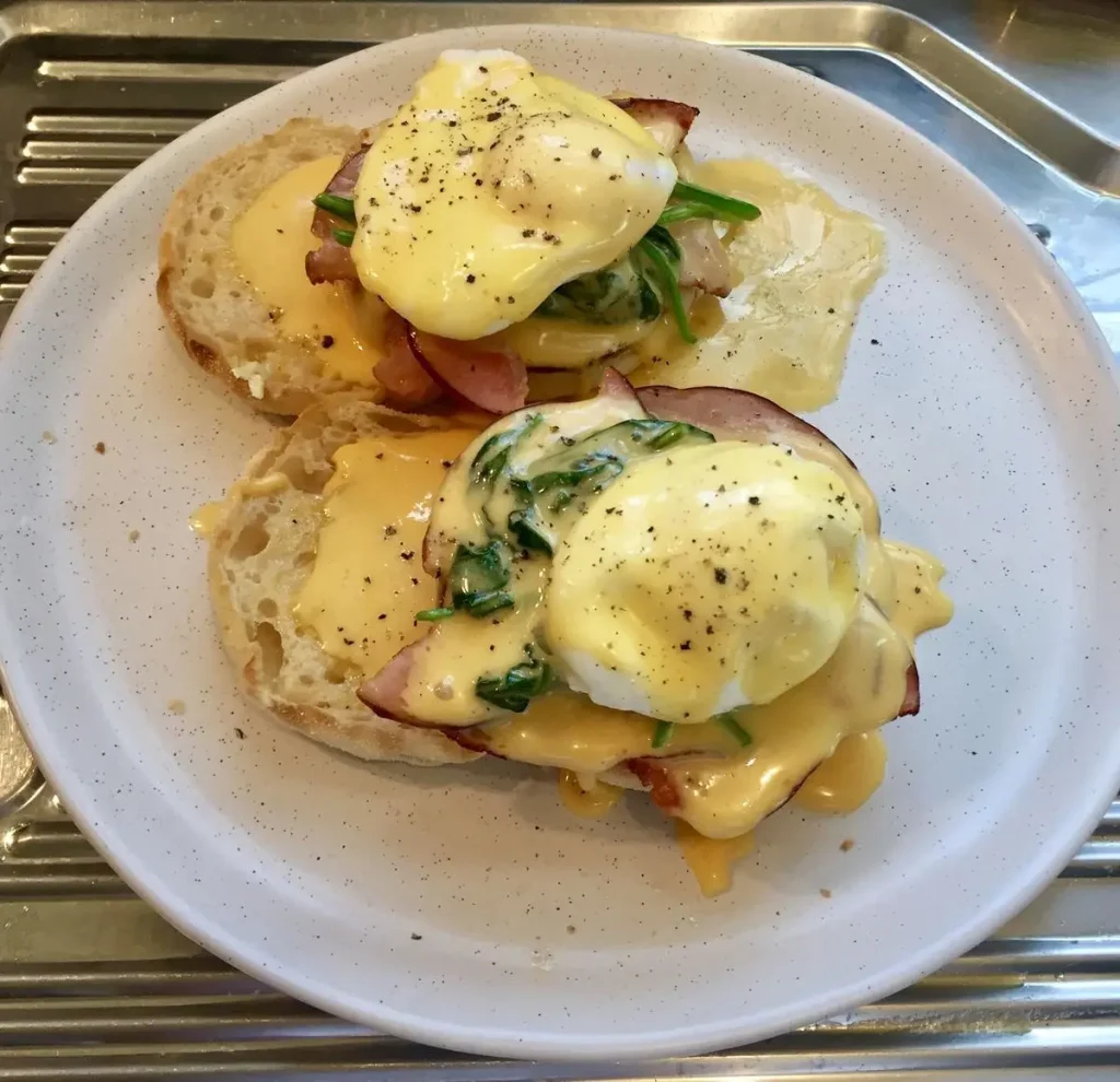 Freshly smashed avo, spinach, garlic & thyme mushrooms, a soft poached egg & whipped ricotta on toasted sourdough.
