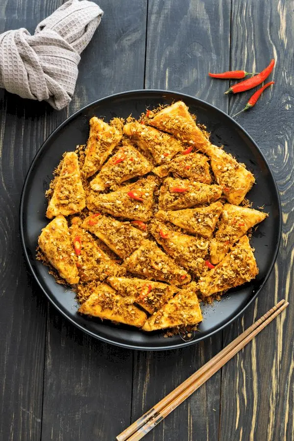 “Jasmine rice, lemongrass tofu, lettuce, cucumber, and pickled carrots garnished with scallions oil.