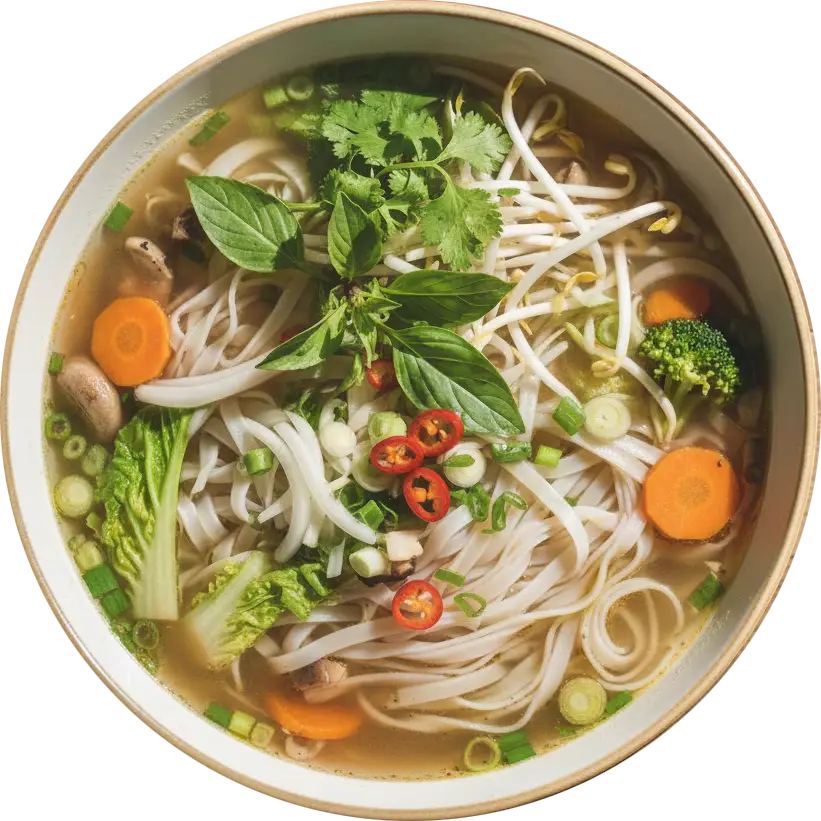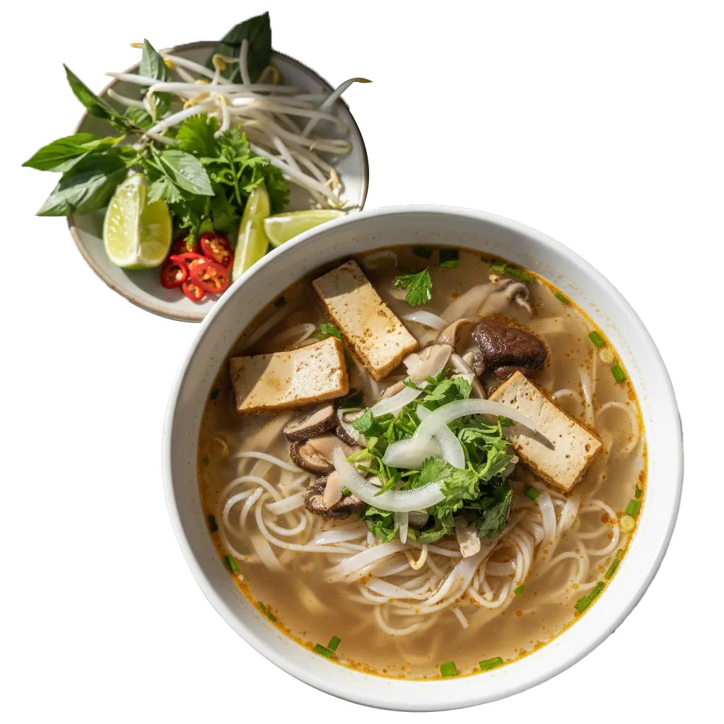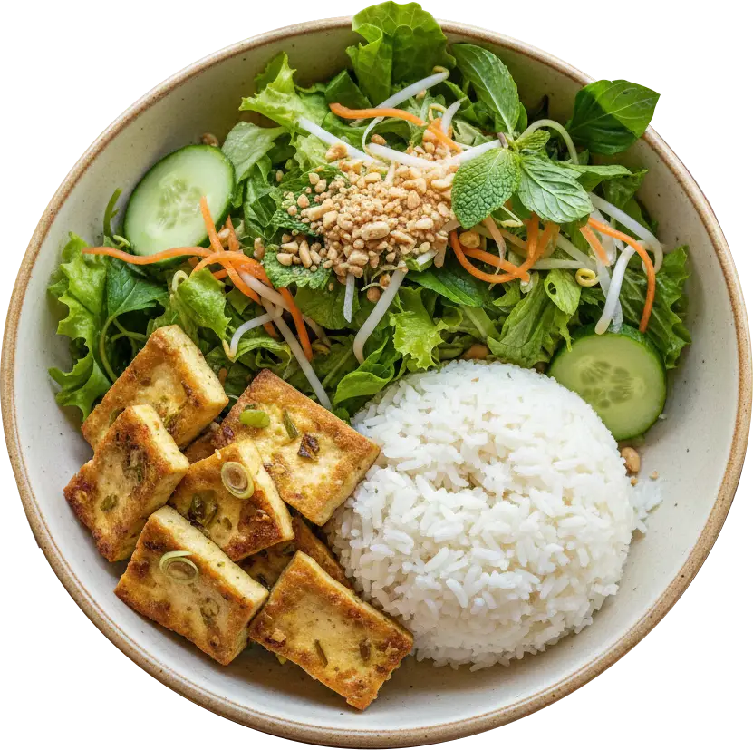 Vermicelli noodle served with shredded tofu, net spring rolls, mix salad, cucumber, pickled carrots, fresh herbs, and garnished with roasted peanuts.Dressing on the side. Gluten free dressing upon request.