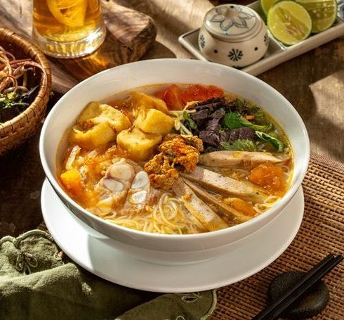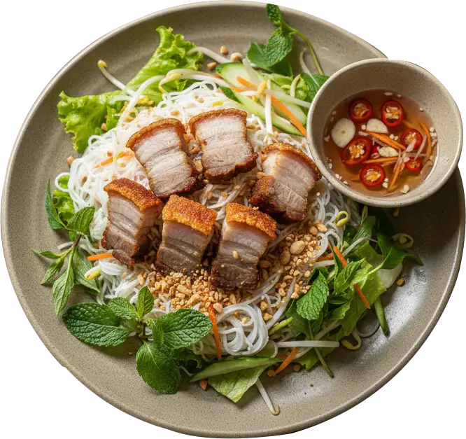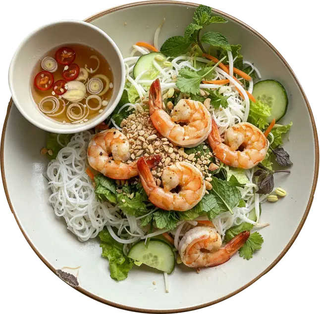 “Vermicelli noodle served with mix salad, cucumber, pickled carrots, and fresh herbs garnished with roasted peanuts. Fish sauce dressing on the side.”