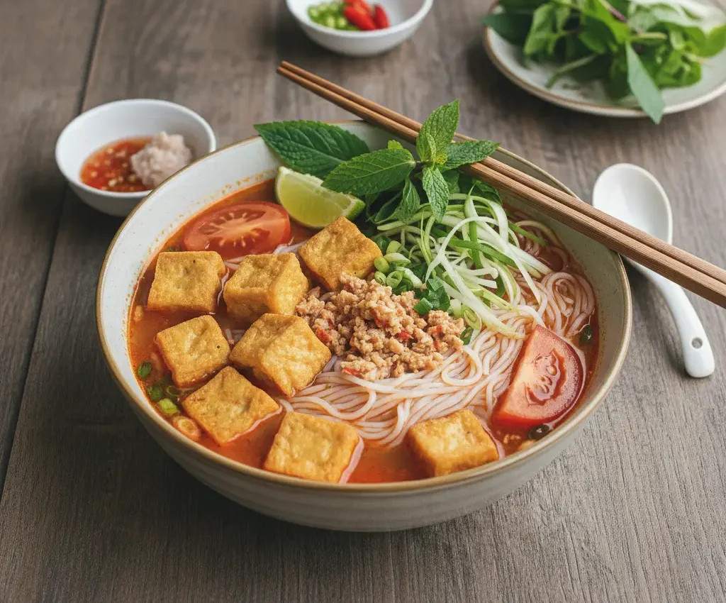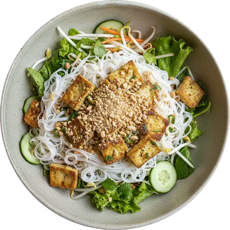 Vermicelli noodle served with lemongrass tofu, mix salad, cucumber, pickled carrots, fresh herbs, and garnished with roasted peanuts.