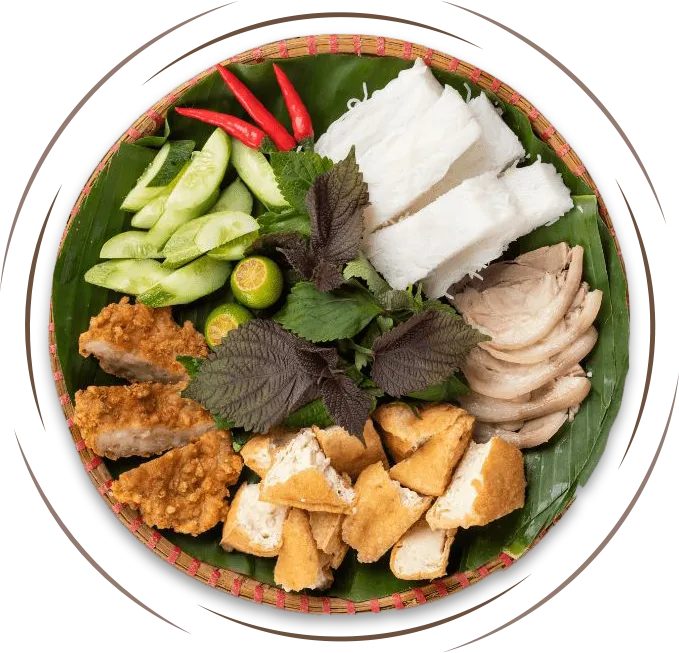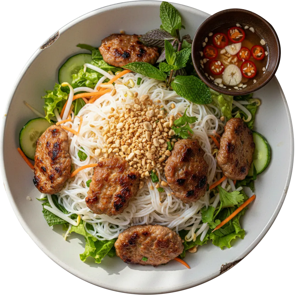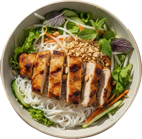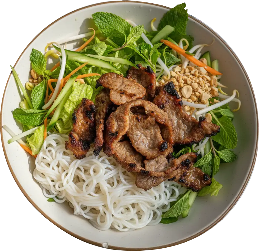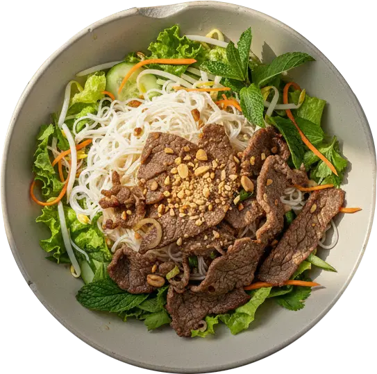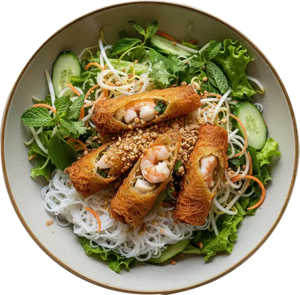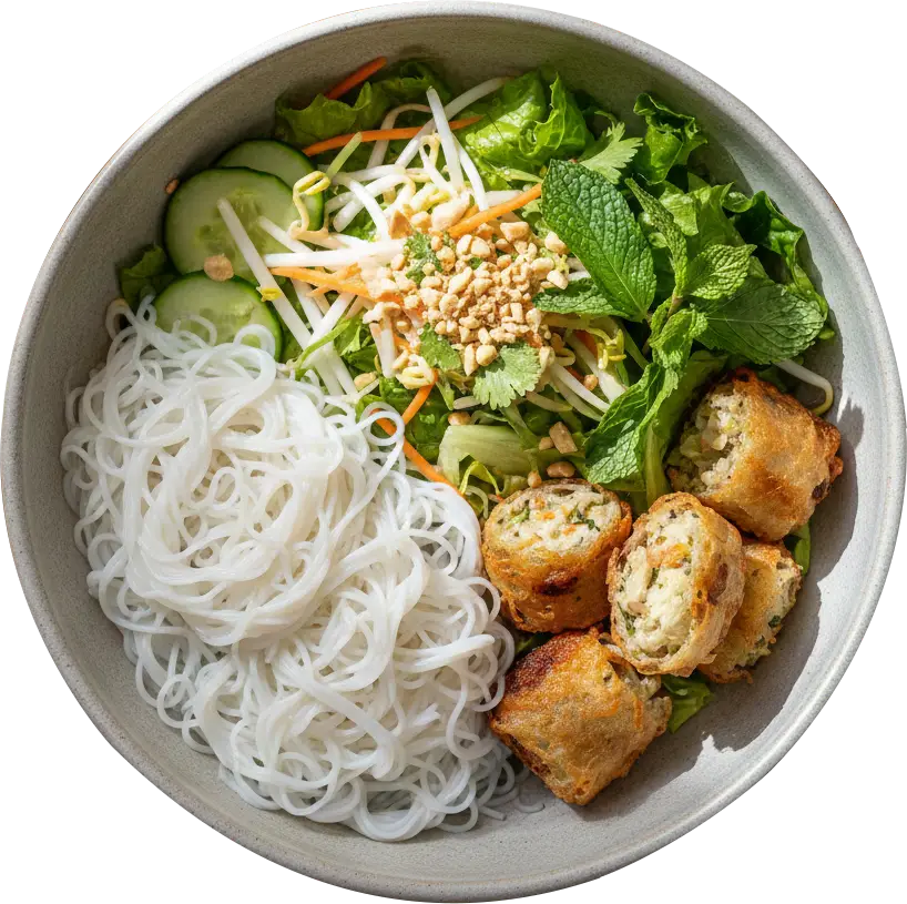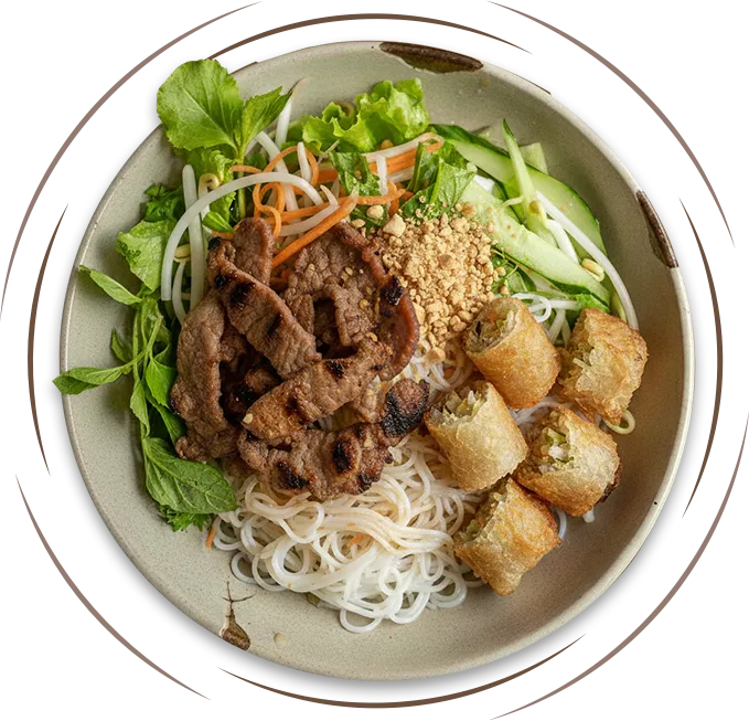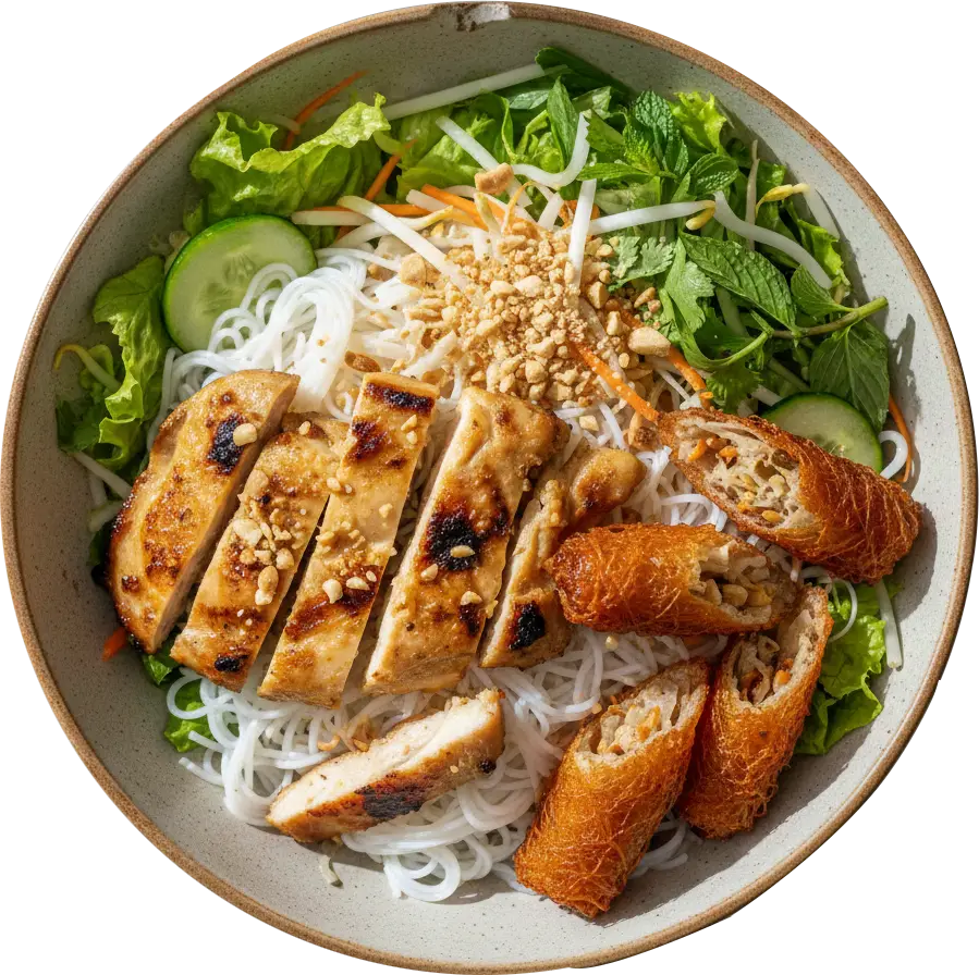 Vermicelli noodle served with net spring roll, mix salad, cucumber, pickled carrots, fresh herbs, and garnished with roasted peanuts.