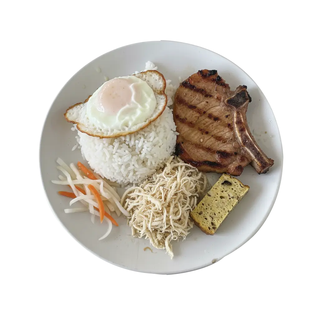 Jasmine rice, vegetarian pork chops, shredded tofu, mix salad, cucumber, and pickled carrots garnished with scallions oil. Dressing on the side.